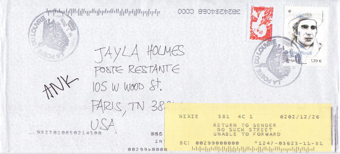 Mon dernier projet était local, photographique et alphabétique, tandis que celui-ci est mondial, extrême, cinématographique et littéraire. Il est basé sur le concept de «poste restante» (un service proposé par les bureaux de poste permettant de conserver un courrier jusqu’à ce que son destinataire vienne le retirer). Bien sûr, personne ne viendra chercher l’enveloppe et elle sera retournée à son expéditeur (moi-même) au bout de quelques jours. J’aime imaginer le voyage aller-retour de ces enveloppes vides, qui voyagent en camion, en avion, en bateau ou en vélo. Je tiens à remercier les dizaines de mains anonymes qui participent à ce projet inutile.